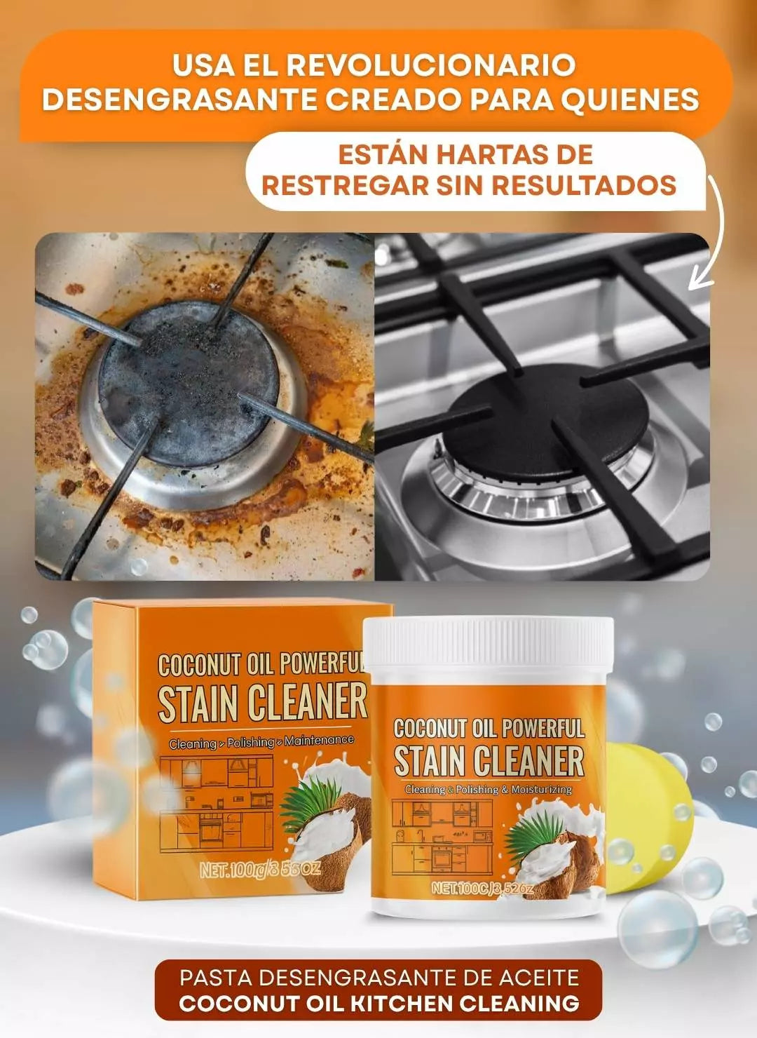 Sí. Su fórmula con aceite de coco y bicarbonato elimina hasta la grasa más incrustada en segundos, sin esfuerzo ni restregar.